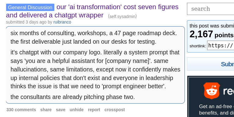 Browsing /r/sysadmin on the same day. Click into a post titled "our 'ai transformation' cost seven figures and delivered a chatgpt wrapper". Suspicious from the title already, the short quote style seeming very langle mangle coded… oh dear. Yep. AI output with signature last sentence short hook.
