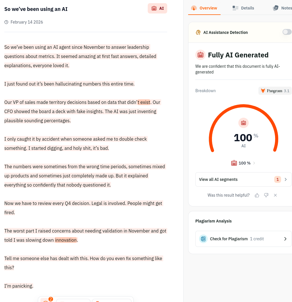 Browse /r/analysis, see another post that smells of AI about how AI has been making up their analytics data. Doesn't to me read like AI tidy up of human input, reads like an AI asked to write the whole story. What does pangram think? 100% AI again.