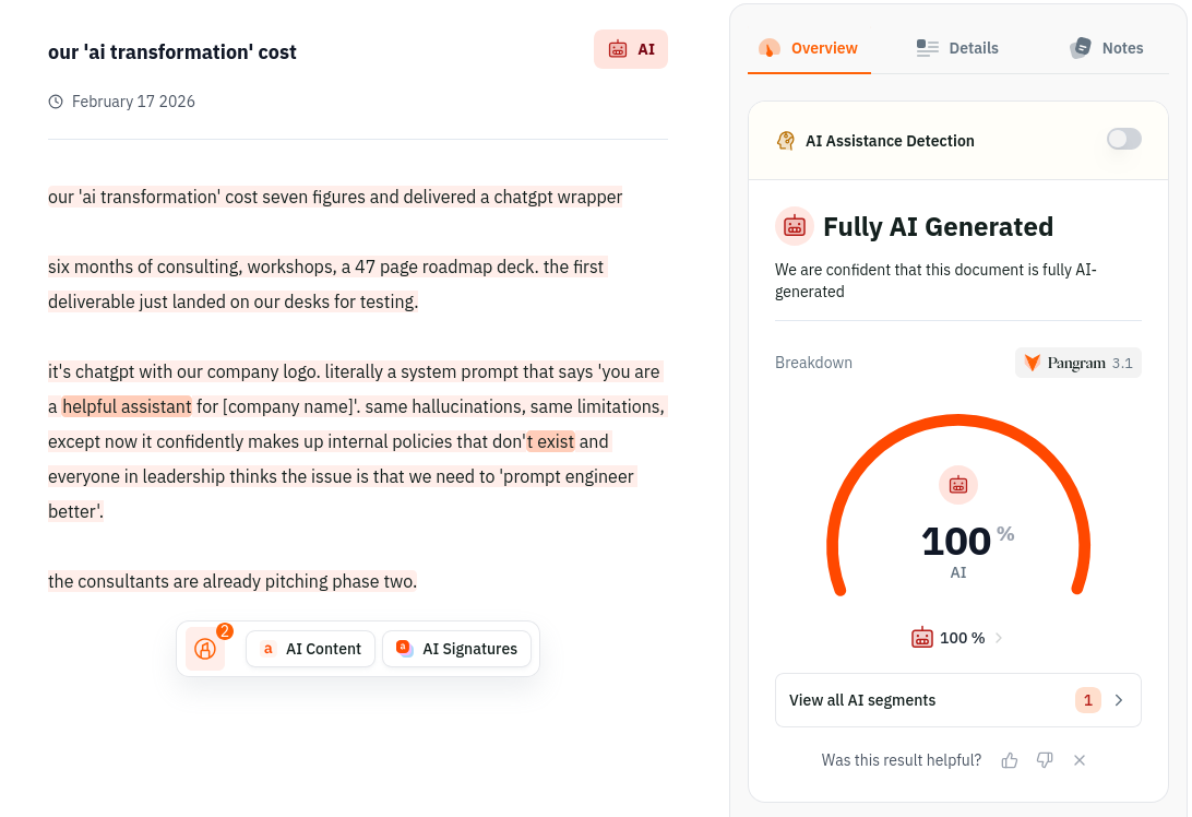 Browsing /r/sysadmin on the same day. Click into a post titled "our 'ai transformation' cost seven figures and delivered a chatgpt wrapper". Suspicious from the title already, the short quote style seeming very langle mangle coded… oh dear. Yep. AI output with signature last sentence short hook.