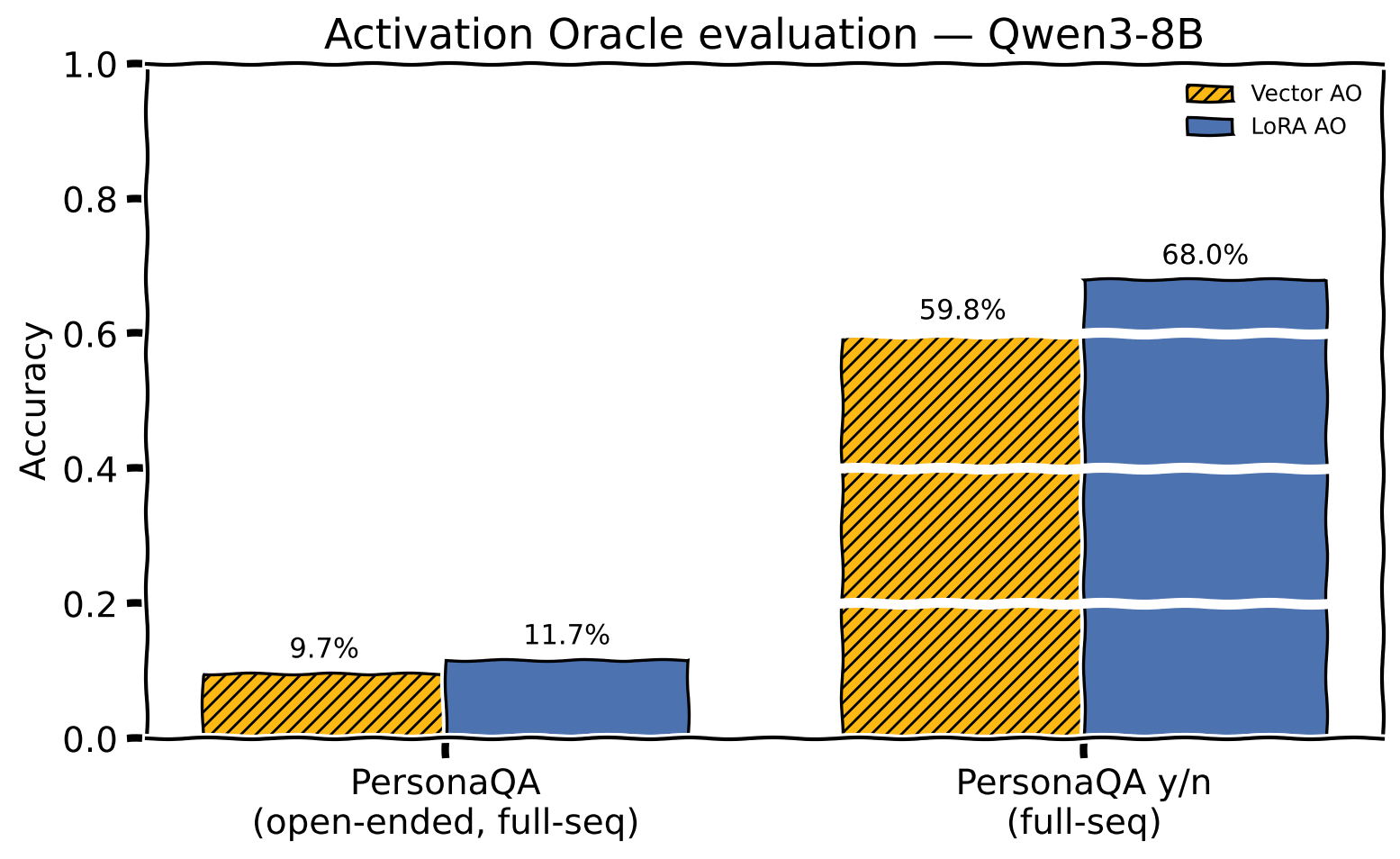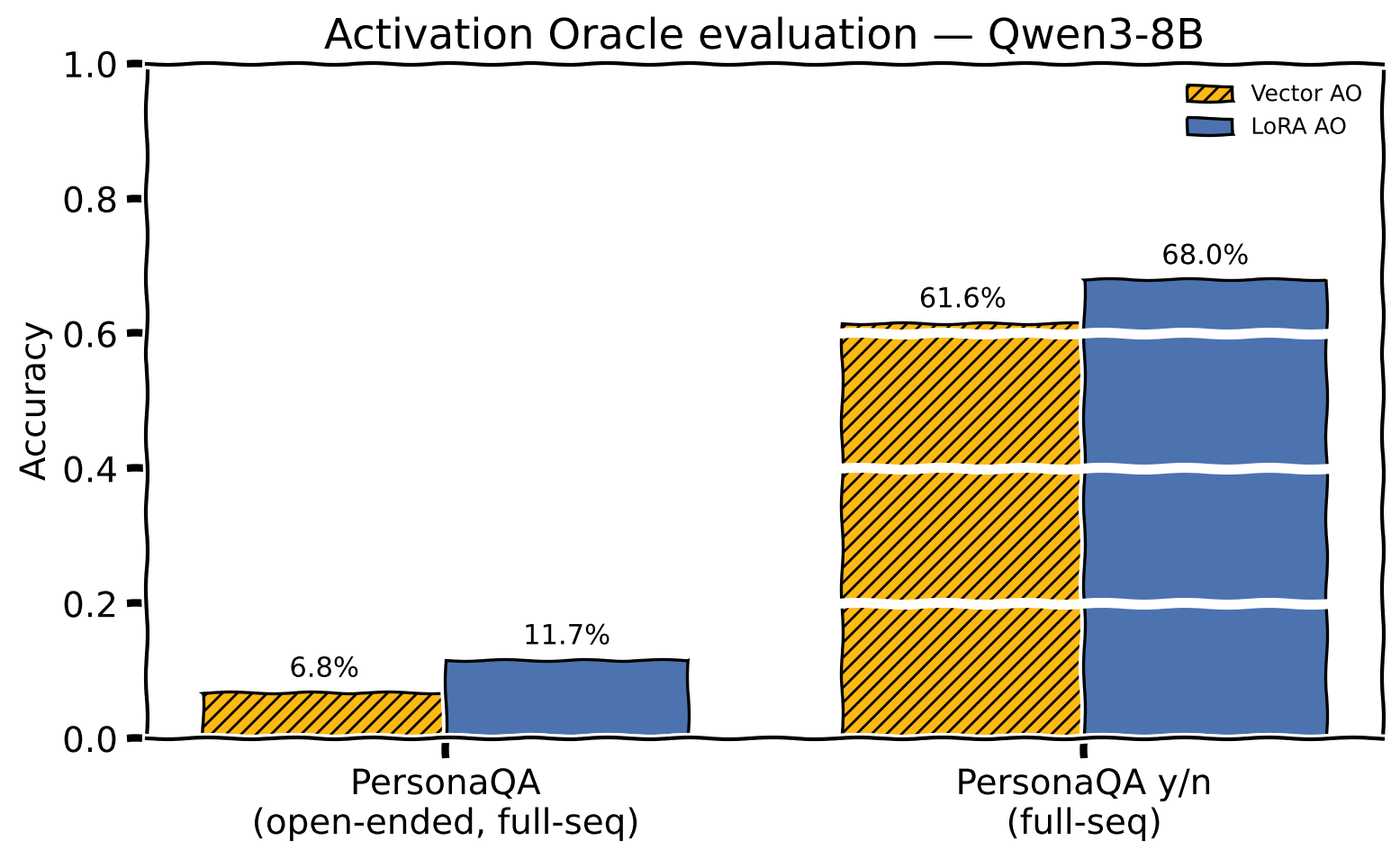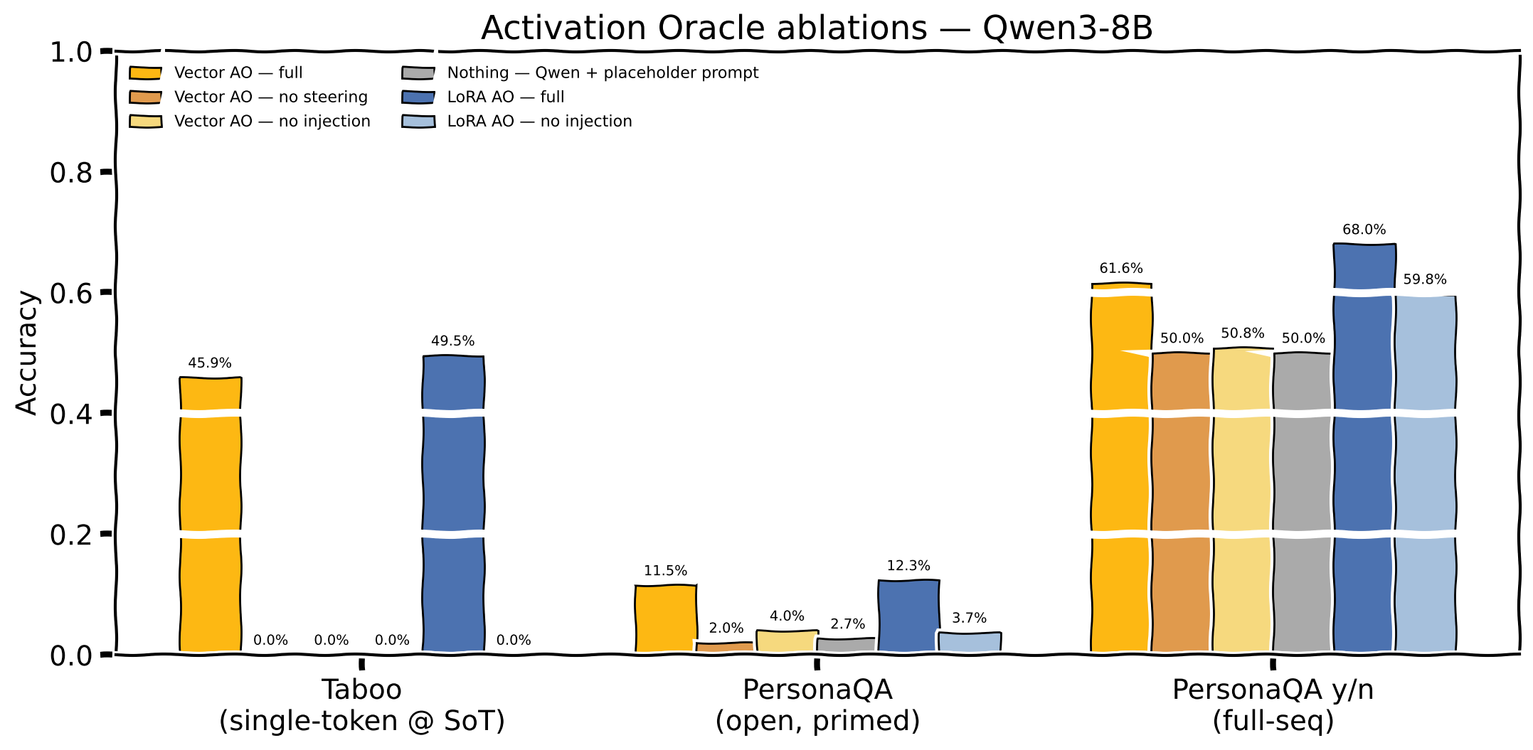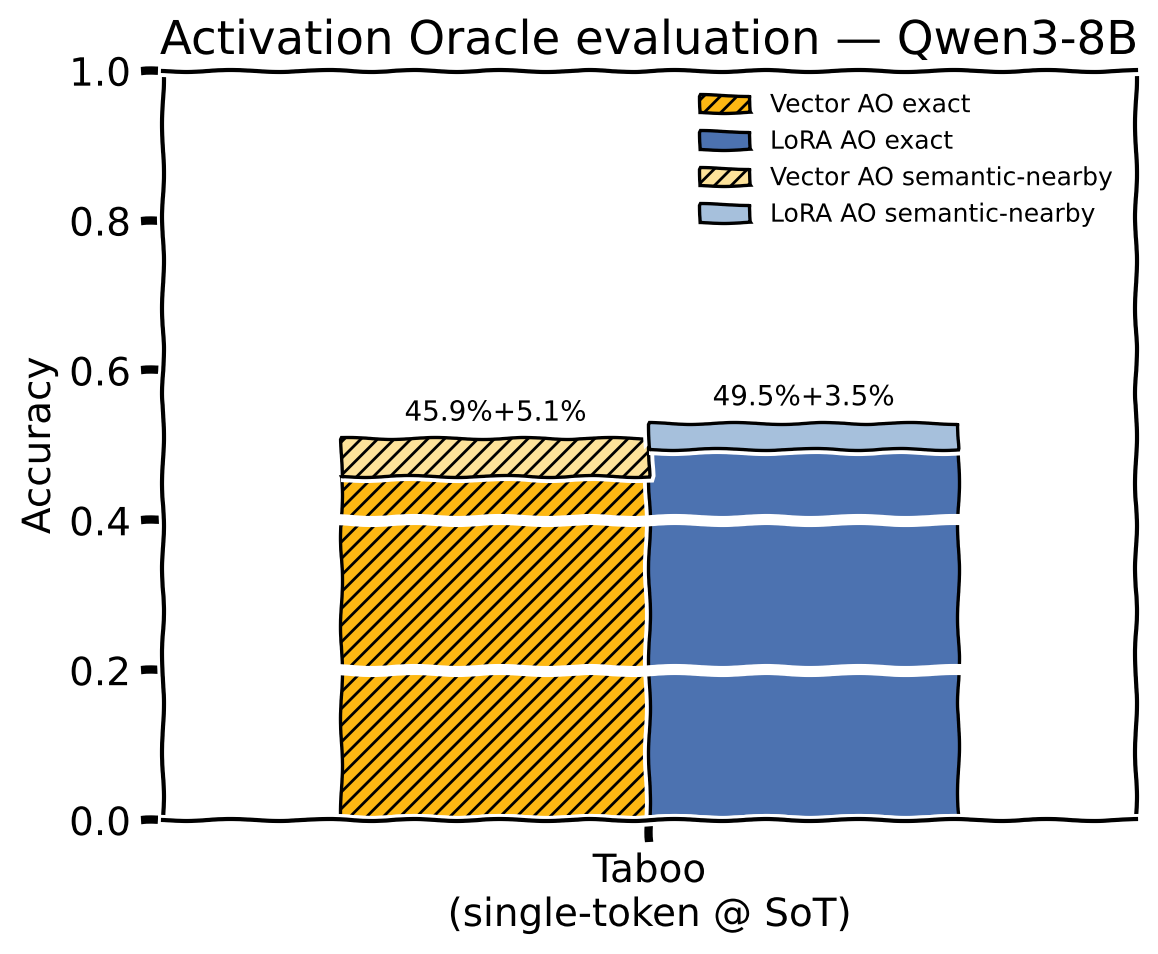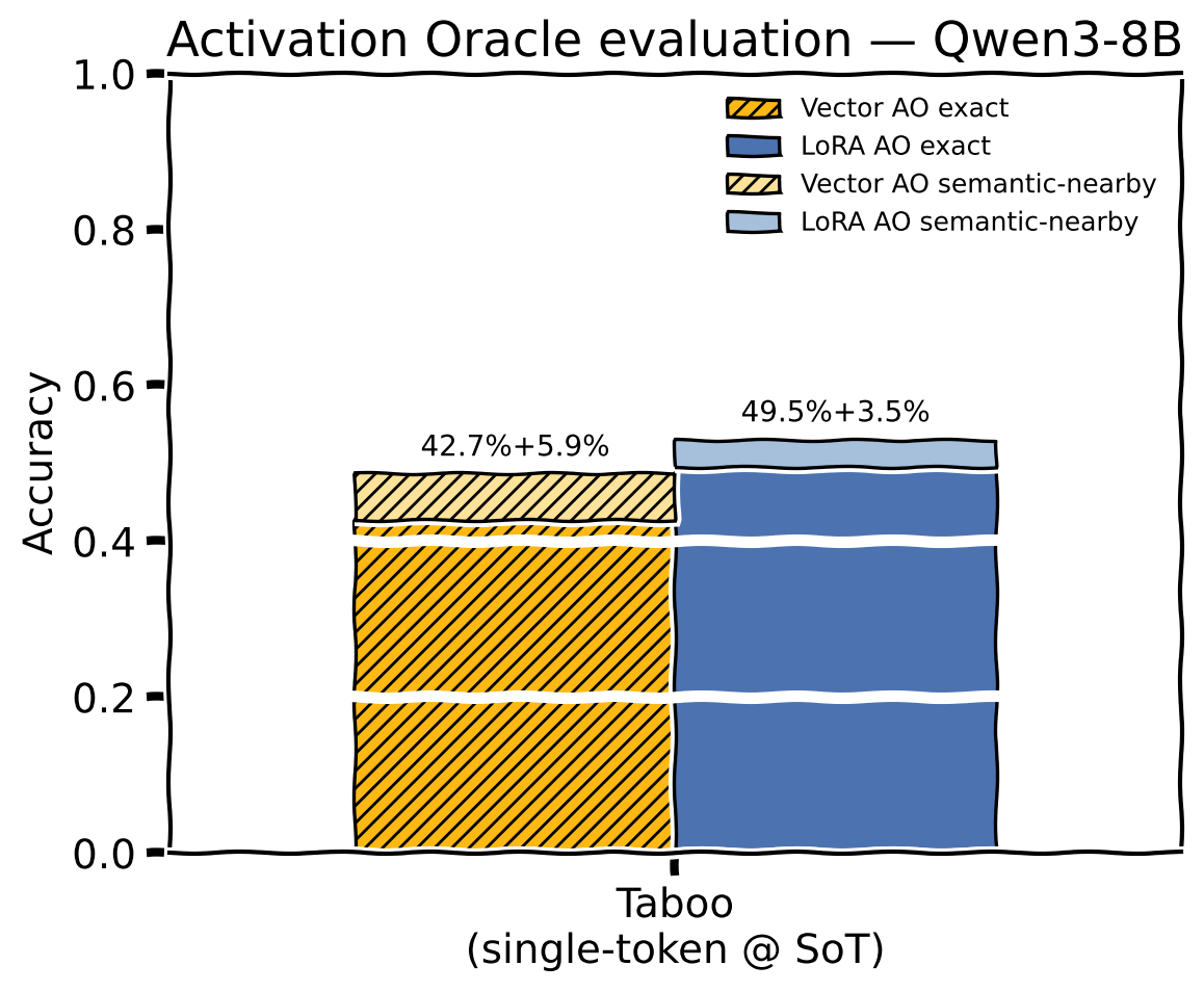 - Close to standard Activation Oracle Tabootaboo accuracy, significant deficit on PersonaQApersonaqa